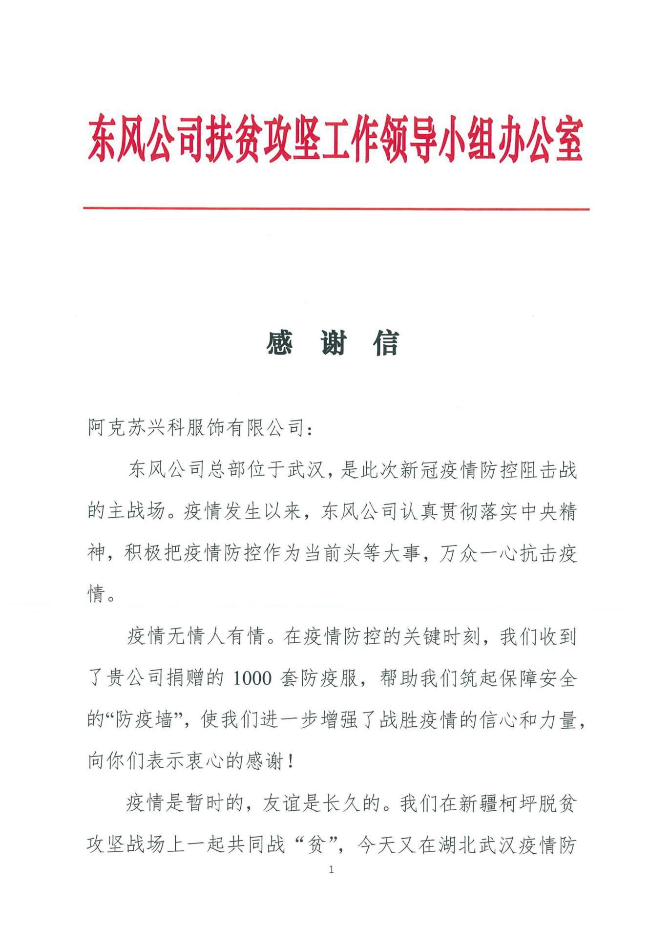 东风公司给我公司发来感谢信